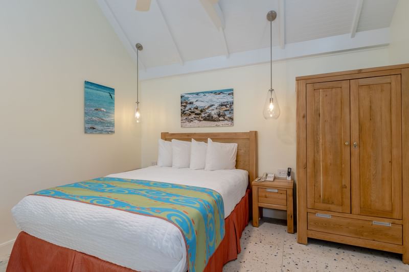 Comfortable Aruba studio for two with a queen bed, walk-in shower, and kitchenette. Features flat-screen TV, fast Wi-Fi, warm lighting, local art, and a health box for fresh, purified air.